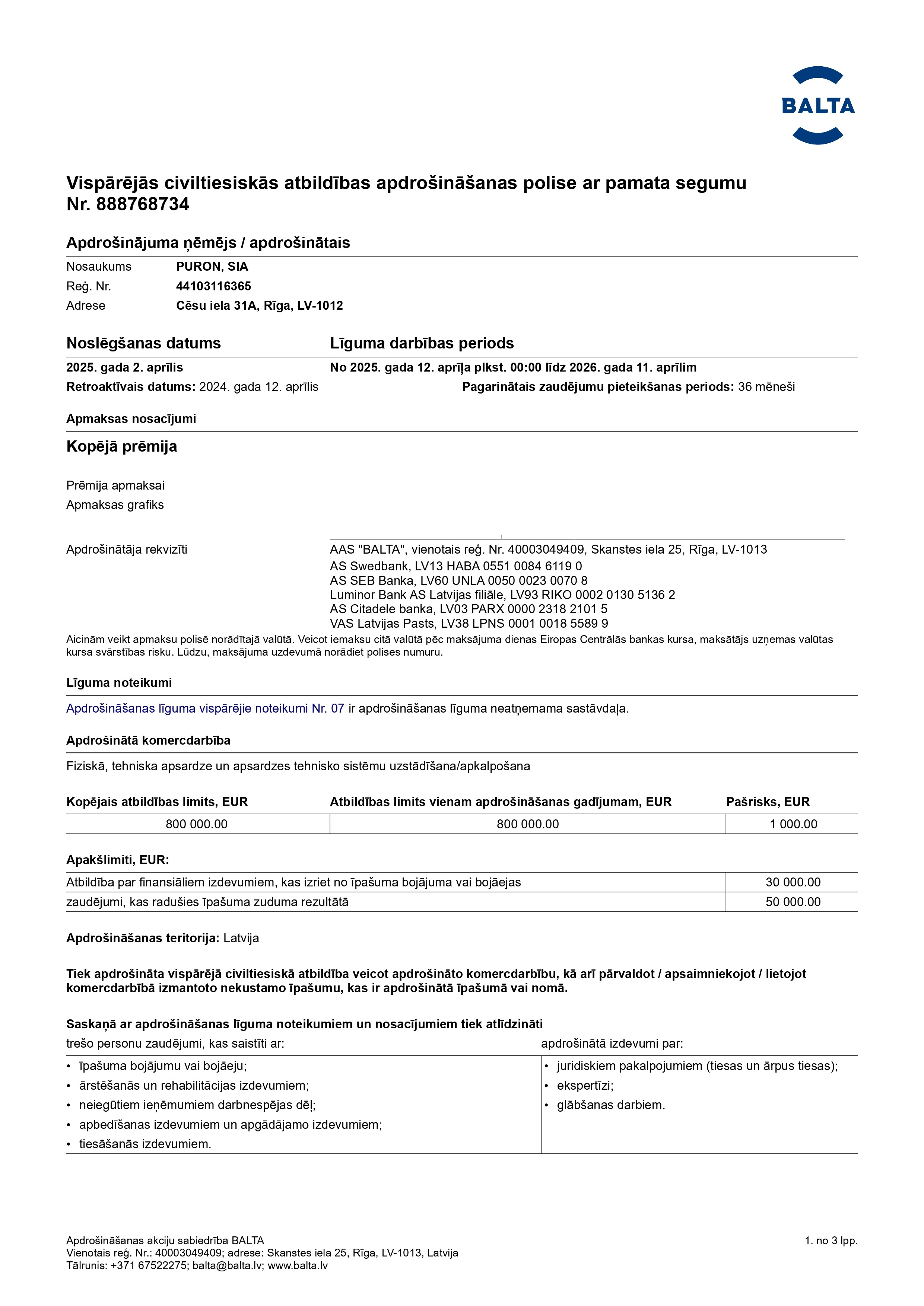 SIA “PURON” ir licencēts (Tehniskā apsardze/00012024TA) un apdrošināts